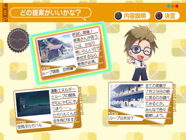 途中にはLRC(Loop Research Conference、ループ研究会議)が導入される。画面上に3つのイベントカードが表示され、目当てのものがなければシャッフルしつつ、自由に選択できるというものだ。科学部員との他愛ない実験の様子を描き、さらにクリア毎にイベントが増えていくが、攻略には直接影響しない。攻略とは離れたところで、繰り返されるループの中で青春を積み重ねていく主人公たちを温かく見守る……それが本作の目的のひとつなのだ。
