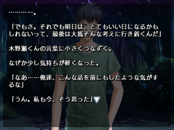 実は私も初回プレイ時にこれが原因で詰まってしまった。罠とも取られてしまいかねないゲームデザインだが、本作の謎ときわめて密接な関係を持っている。プレイヤーの手で「初めから」を選ばせる、その行為に確固たる意味を持たせているのである。一見するとささやかな仕組みではあるが、ループ系ノベルゲームとはどうあるべきか熟慮した上で盛り込まれたものなのだろう。